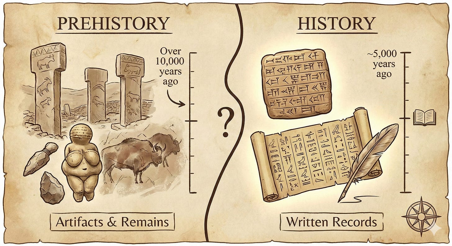 What about all that stuff that happened before writing, like Göbekli Tepe or a Venus figurine from more than 10,000 years ago? The cultures who produced those items are a very important part of our story, but since they predate written language, they fall into the category of prehistory.
